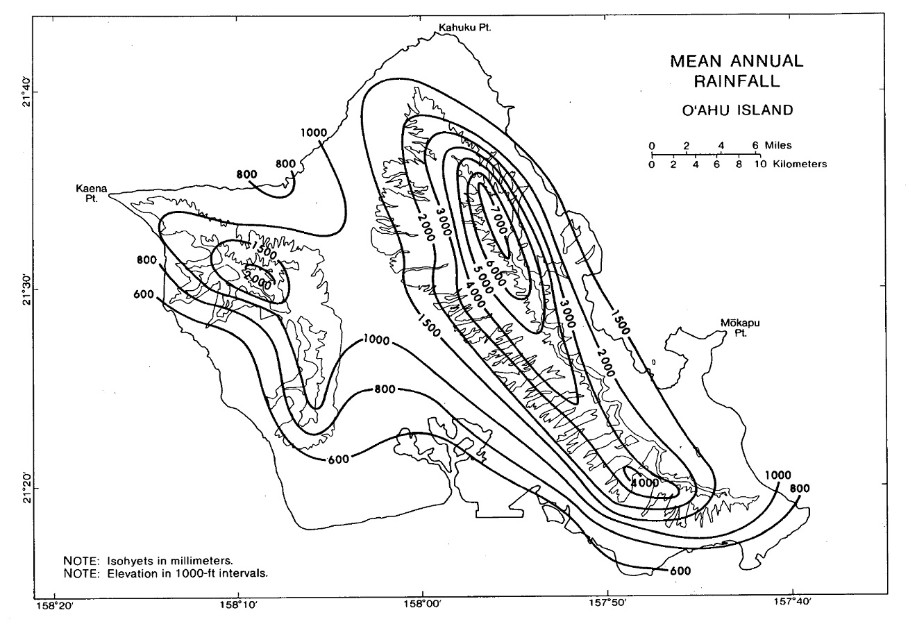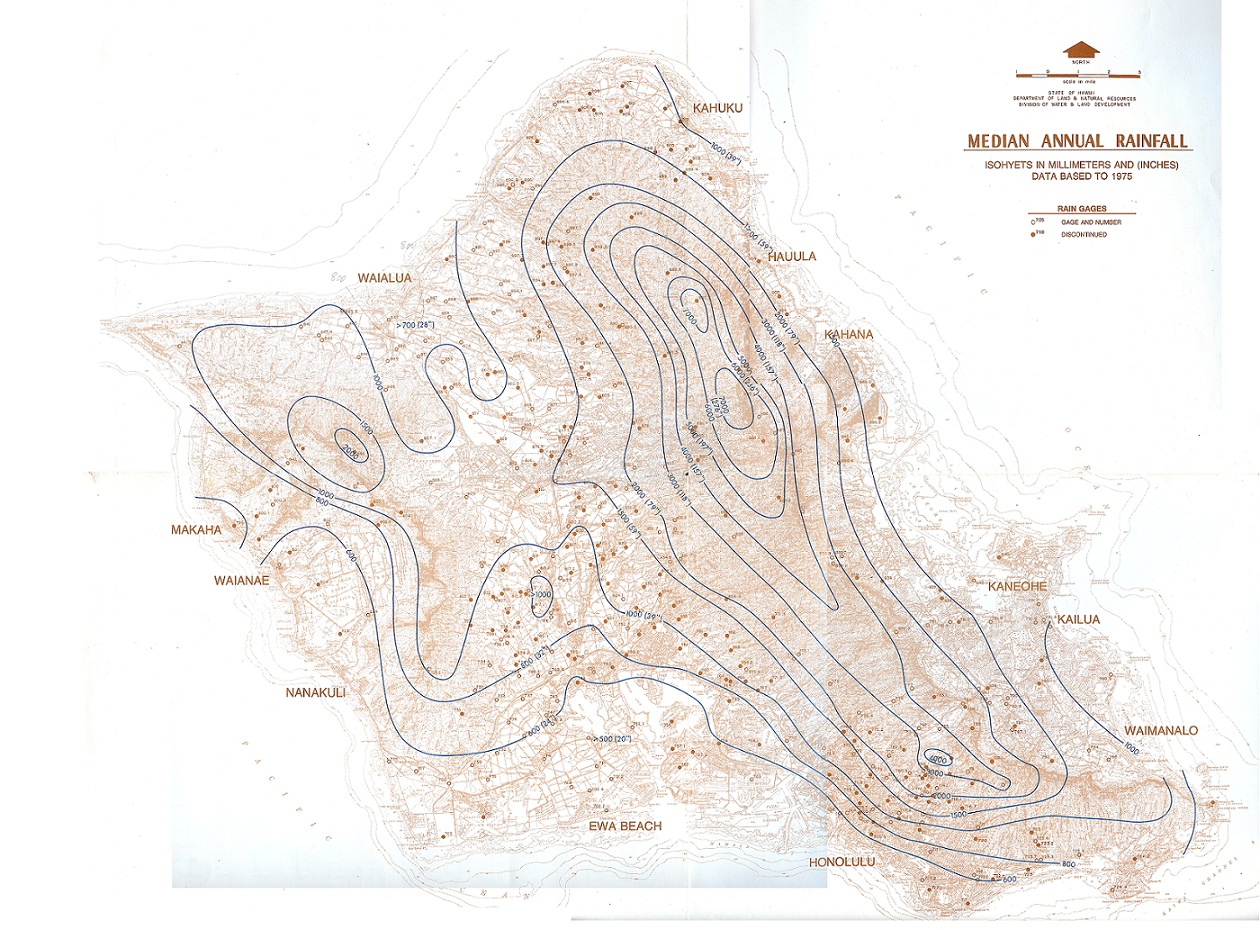 ![]() | Map of median annual rainfall for the island of Oʻahu, developed by Meisner et al. in 1982. The base period of the statistics is 1916–1975. |