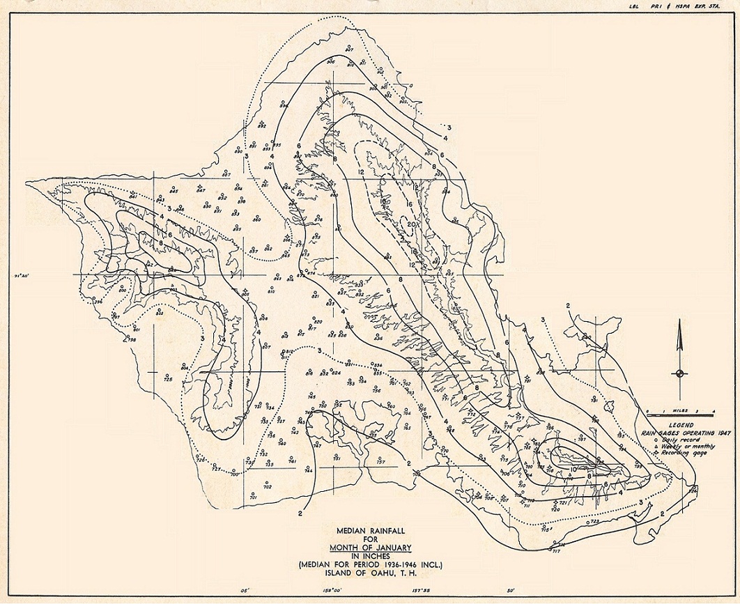 Halstead, M.H. and Leopold, L.B. 1948. Monthly median rainfall maps, what the are--how to use them. Report No. 2, Meteorology Department, Pineapple Research Institute and Hawaiian Sugar Planters' Association. 18 pp.