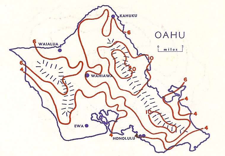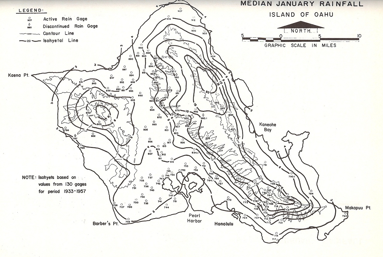 ![]() | Map of mean January rainfall for the island of Oʻahu, developed by Mordy and Price in 1955. No common base period was used. Periods of record ranged from 10 to 68 years. |