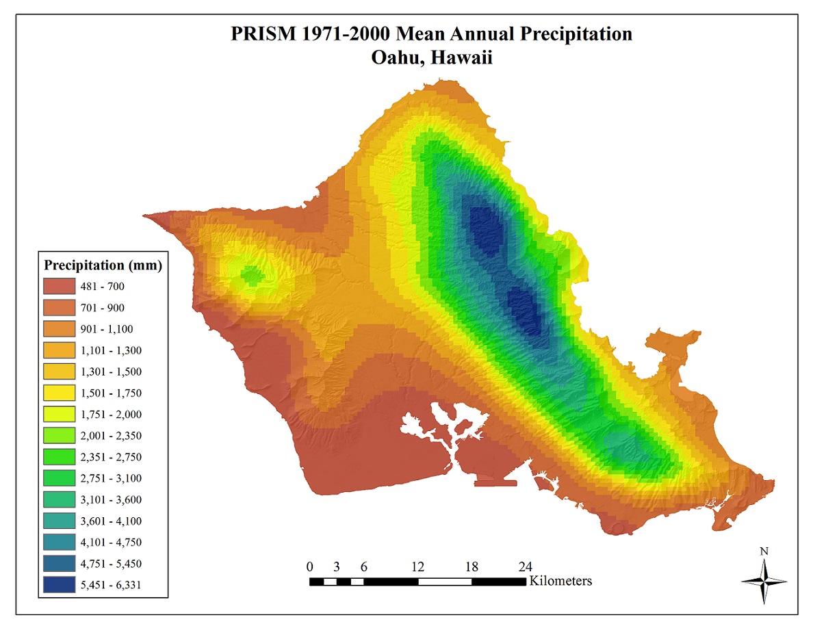 ![]() | Map of mean annual rainfall for the island of Oʻahu, developed by the PRISM Group in 2006. The base period of the statistics is 1961–1990. |
